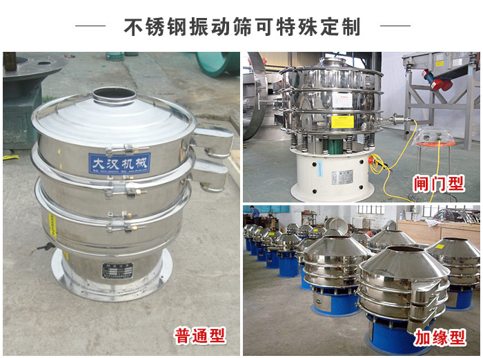 不銹鋼振動(dòng)篩可按特殊需求特殊定制,是否需要特殊設(shè)計(jì)定制,如“加緣型、閘門型、密封型,或是框體、底座加高,進(jìn)料口加料斗等,滿足客戶因場地大小高低配套使用的不同需求。