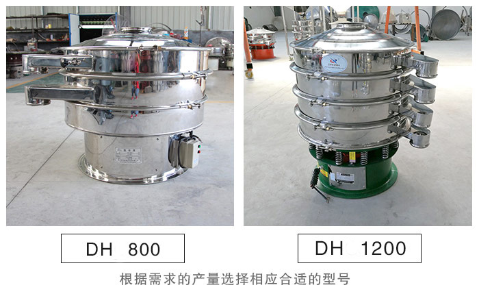 不銹鋼振動(dòng)篩型號(hào)有DH600、DH800、DH1000、DH1200、DH1500、DH1800 、DH2000等。滿足客戶不同的篩分產(chǎn)量需求,客戶可根據(jù)需求的產(chǎn)量選擇相應(yīng)合適的型號(hào)。