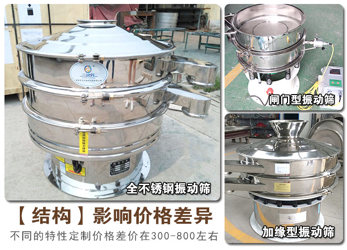 有機化肥不銹鋼振動篩對客戶的不同篩分需求支持特殊結構的設計定制,如“加緣型、閘門型、或是框體、底座加高,進料口加料斗等。不同的特性定制價格差價在300-800左右。