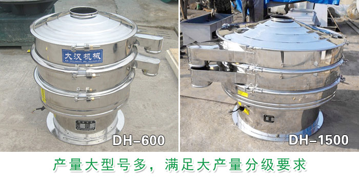 DH系列不銹鋼振動(dòng)篩處理量可達(dá)400kg-1T/h。型號(hào)齊全型號(hào)分為直徑400mm型、600mm型、800mm型、1000mm型、1200mm型、1500mm型、1800mm型、2000mm型等八種標(biāo)準(zhǔn)機(jī)型??筛鶕?jù)所需求的產(chǎn)量選擇合適的型號(hào),還可根據(jù)需求特殊定制。