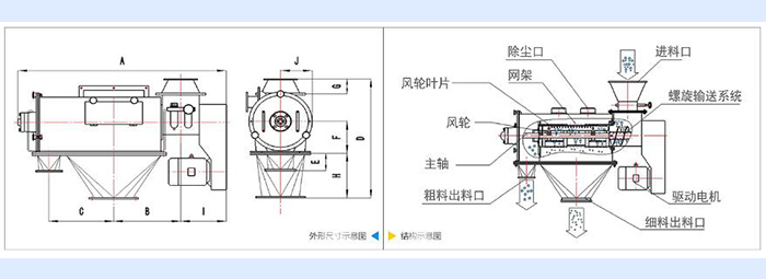 淀粉臥式氣旋篩由進(jìn)料口、除塵口、網(wǎng)籠、螺旋輸送系統(tǒng)、風(fēng)輪葉片、風(fēng)輪、主軸、驅(qū)動(dòng)電機(jī)、粗料出料口、細(xì)料出料口組成。