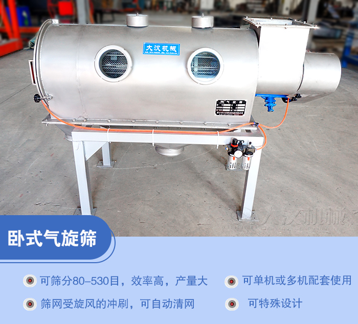 淀粉臥式氣旋篩可對(duì)細(xì)度范圍在80-500目?jī)?nèi)的粉狀物料很好的連續(xù)篩分,篩網(wǎng)可任意更換,材質(zhì)上分為不銹鋼材質(zhì)與碳鋼材質(zhì)兩種,通過在密閉狀態(tài)下利用高速氣流作載體,使充分?jǐn)U散的粉料微粒以足夠大的動(dòng)能向篩網(wǎng)噴射,達(dá)到分級(jí)目的。特別適合篩分處理輕比重、粘度大、纖維多、有靜電、易團(tuán)聚的微粉和特殊物料。