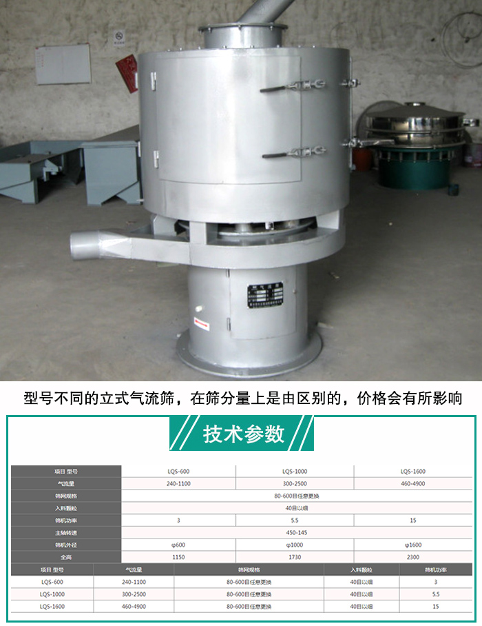 型號不同的立式氣流篩,在篩分量上是由區(qū)別的,價格會有所影響。大漢立式氣流篩型號有LQS-600型、LQS-1000型、LQS-1600型等,不同型號的立式氣流篩,其氣流量、電機(jī)功率、篩機(jī)外徑等都是不同的,所以價格自然也是不同的。